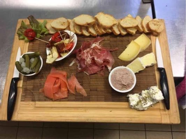 A choisir sur place : jambon cru, rillettes d’oies mayennaises , truite fumée, saucisson, fromages locaux ou légumes marinées
