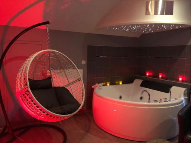 La suite balnéo ronde dont la superficie est de 45 m2 est équipée d'une baignoire à bulles privative (2 places) située dans la chambre ainsi que d'une salle de bain avec douche. Lit 160x200, TV LED 82 cm, Wifi ,mini bar, enceinte Bluetooth et lumière d'ambiance